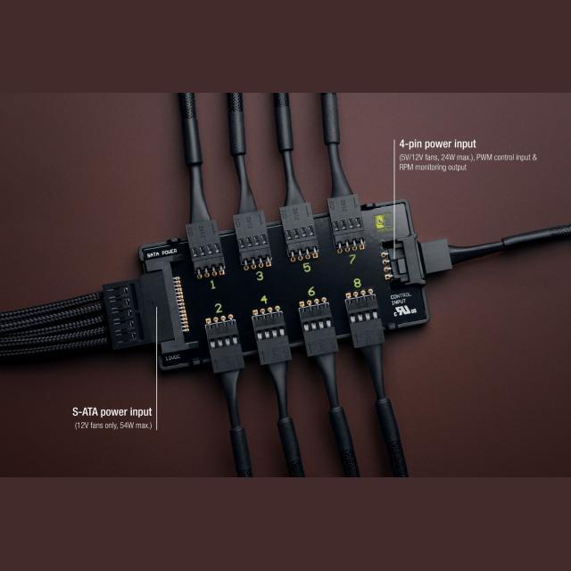 Ideal combination with optional NA-FC1 fan controllerThe NA-FH1 is ideal for controlling multiple PWM fans using the optional NA-FC1 controller. Thanks to a reverse-power design on the 4-pin input of the NA-FH1, the NA-FC1 can control the connected fans even if the hub is powered via its S-ATA interface only and if there is no other connection or input on the 4-pin interface. |