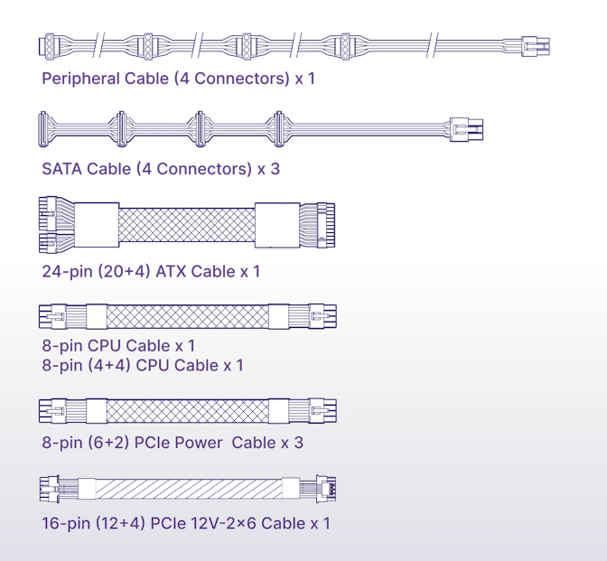 | 24-pin ATX power | 1 | 16-pin (12+4) 12VHPWR PCIe Cable | 1 |