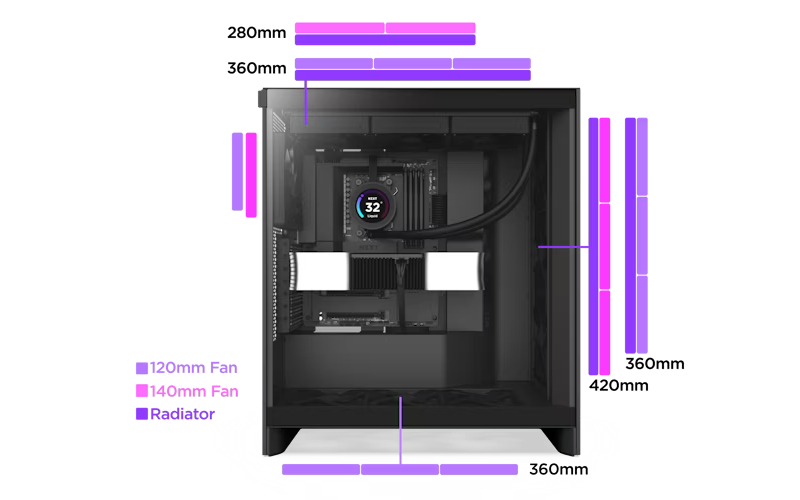 | GPU Length | Up to 410 mm | Top Mounted 140mm / 280mm Radiator & Fan Combined Thickness | Up to 57 mm |