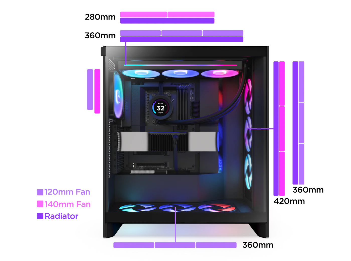 Supports up to a 420mm radiator in front and 360mm radiator up top for max cooling potential.