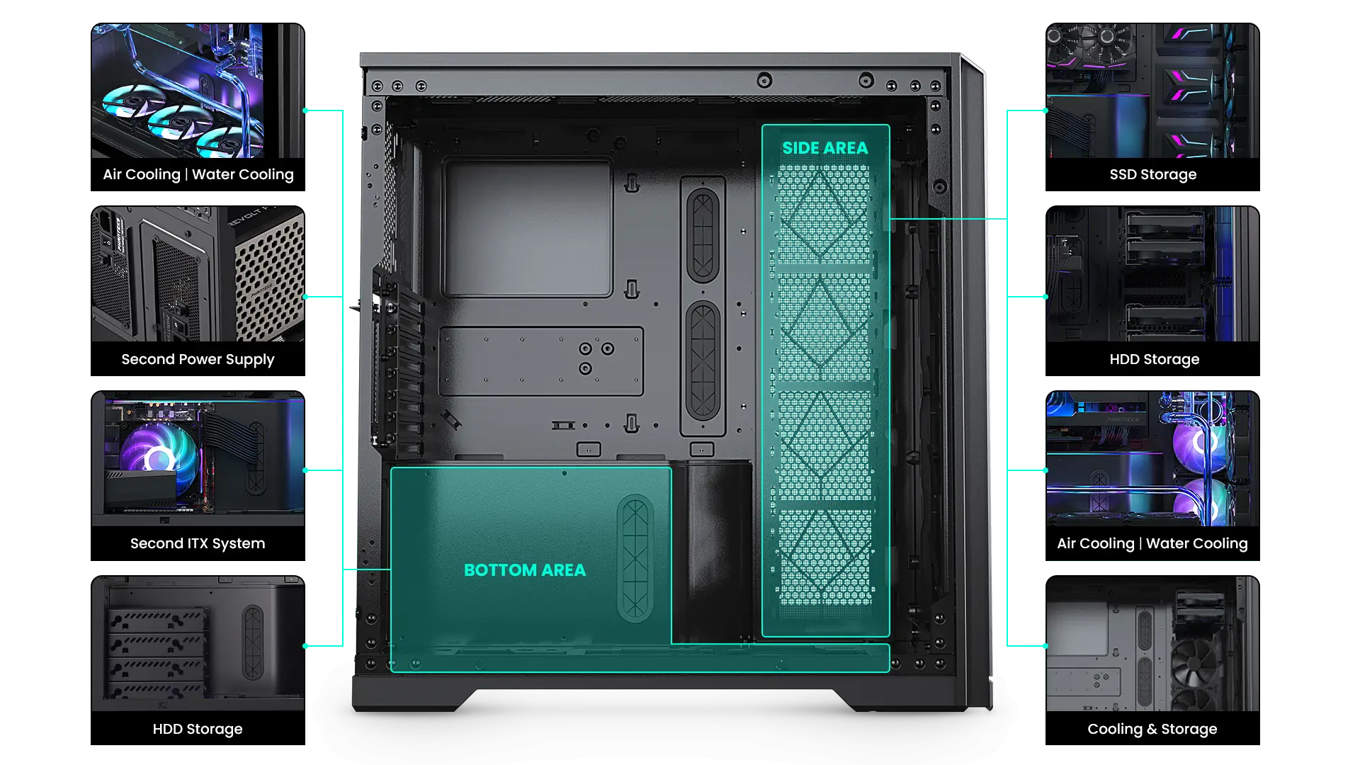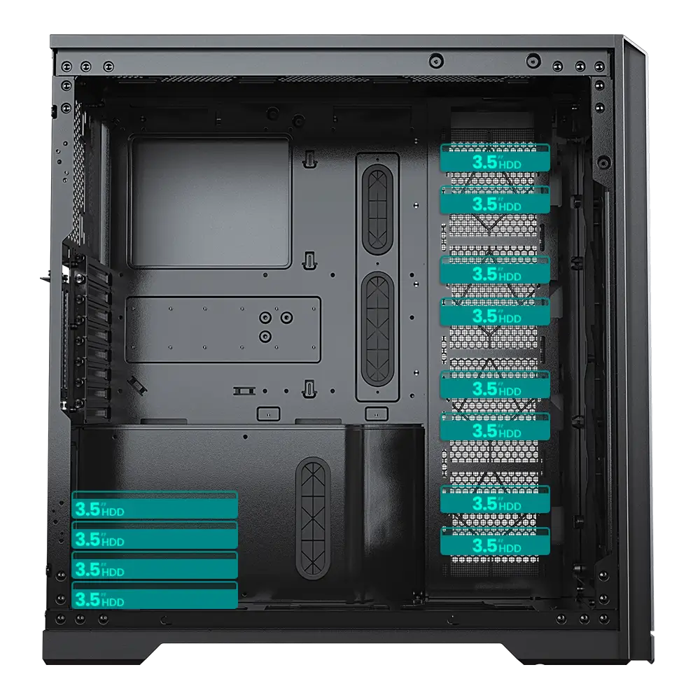 | Mainboard Support | XL-ATX | SSI-EEB | E-ATX | ATX | Micro-ATX | Mini-ITX | Internal 3.5″ Bay | 12 | 4 Included + 3x 2.5″ SSD |