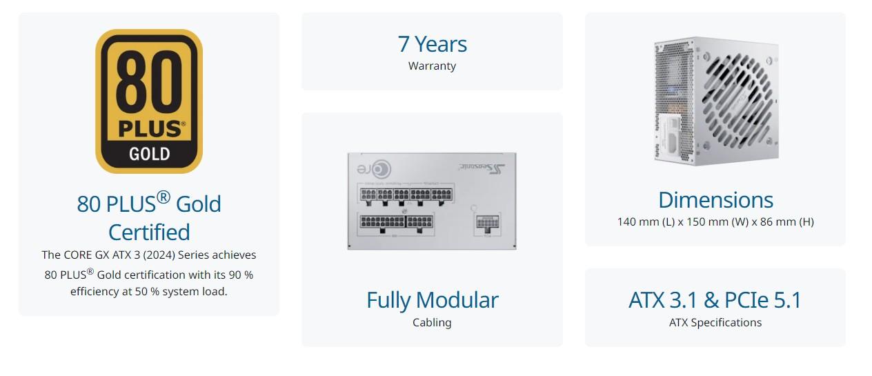 The updated Seasonic CORE GX White ATX 3.1 Series complies with the latest ATX 3.1 and PCIe 5.1 standards and includes four output ranges from 1000 W to 650 W in both black and white colors. Catering to a broad spectrum of PC enthusiasts and system builders, these power supplies provide a fine balance between cost and performance. The 80 PLUS Gold certified Seasonic’s Core GX White line is a fully modular design equipped with white cables featuring a braided pattern. These power supplies are solid performers for a large range of applications, where a 120 mm Hydro Dynamic Bearing fan is combined with Seasonic’s Smart and Silent Fan Control to ensure the optimal cooling performance at the lowest possible noise level. These quality power supplies are backed up by Sea Sonic’s 7-year worldwide manufacturer’s warranty.