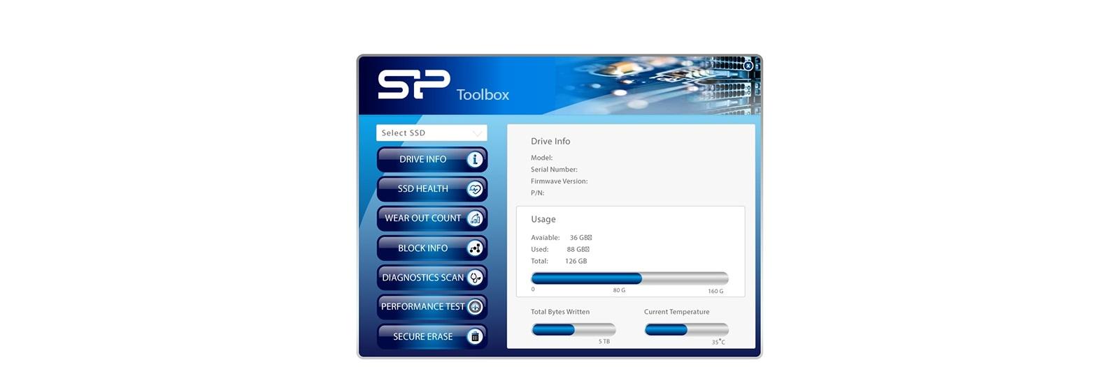 Easily monitor your new SSD's health with our free-download software – SP Toolbox. Run performance tests on the Ace A55, get an overall function evaluation, or check detailed information about your device, including used space, device temperature, total bytes written, and many more.