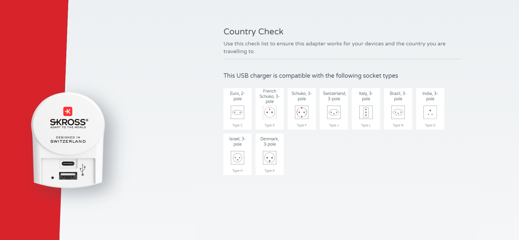 - Compatibil cu toate adaptoarele de calatorie SKROSS