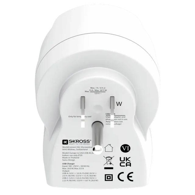 Adaptor universal Skross Europe to USA + 1xUSB-A/C, 20W, 1500284E