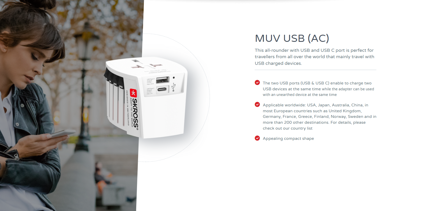 Adaptor de calatorie SKROSS MUV USB-A, USB-C, 1.302962, Alb