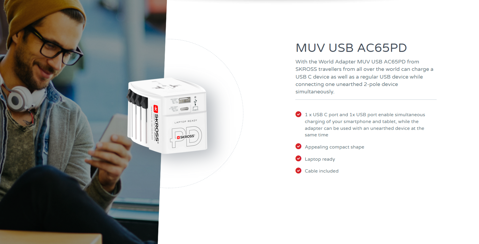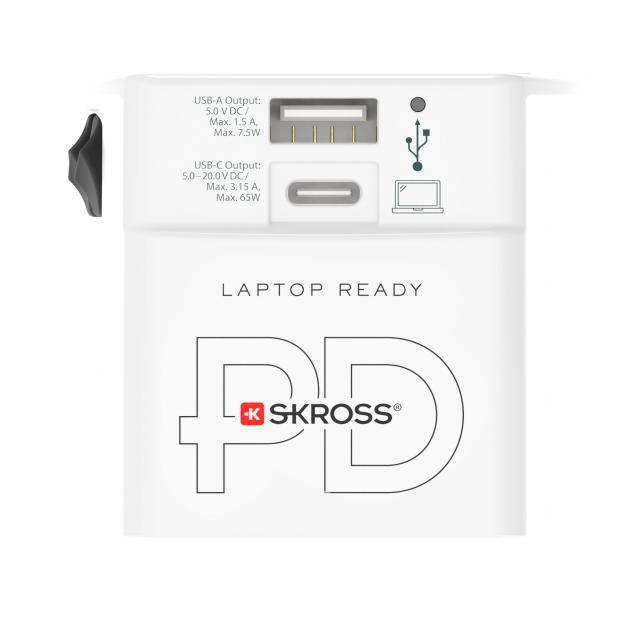 Adaptor de calatorie SKROSS AC65PD, USB-A, USB-C, 1.302976, Alb