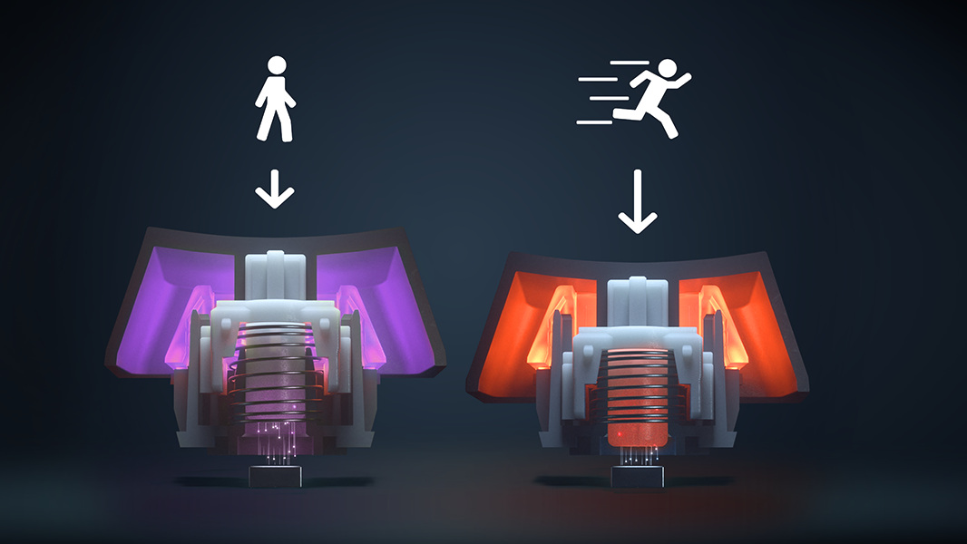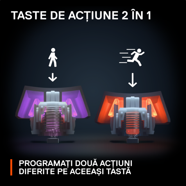 Programează două acțiuni pe o singură tastă, în funcție de cum o apeși. Înaintează cu o apăsare ușoară a tastei, apoi aleargă apăsând aceeași tastă mai puternic. Creează-ți propriile combinații unice cu ajutorul SteelSeries Engine și devansează concurența.