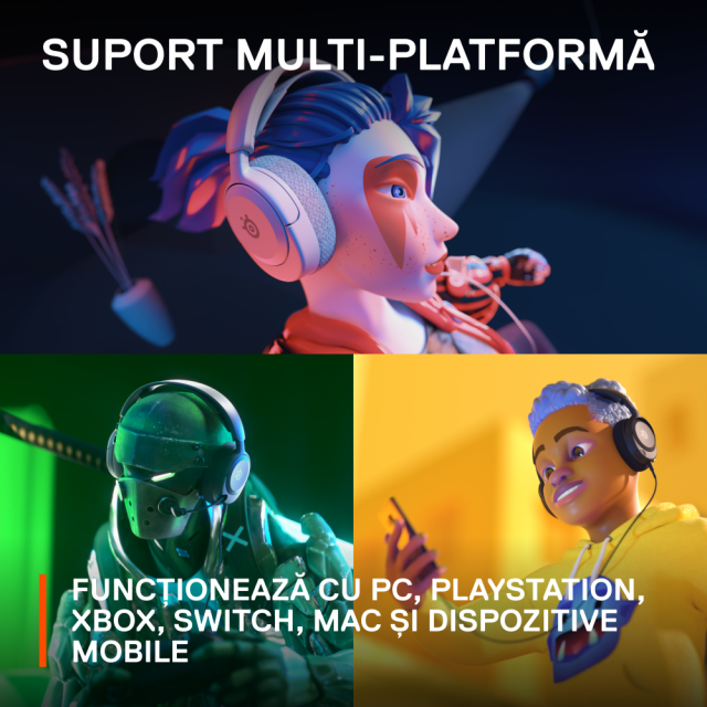 Arctis Nova 1 funcționează cu multiple platforme de gaming, jack-ul universal de 3.5 mm fiind compatibil cu PC, Mac, PlayStation, Xbox și Switch. De asemenea, poți asculta muzică on-the-go de pe mobilul tău.