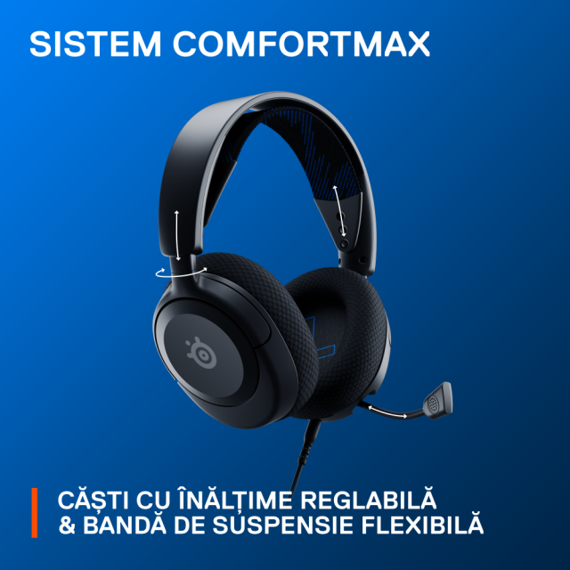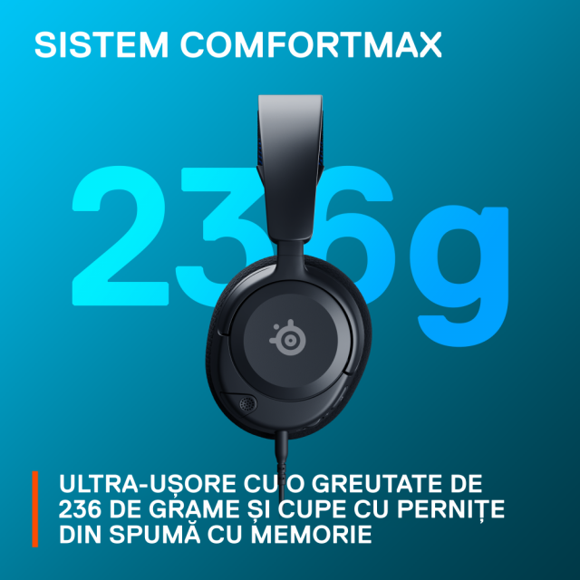 - Ajustabile pentru o fixare perfectă — Sistemul ComfortMAX include cupe rotative cu înălțime reglabilă, pernițe AirWeave din spumă cu memorie și o bandă elastică. Greutatea redusa a căștilor îți asigură confortul, indiferent cât timp te joci.