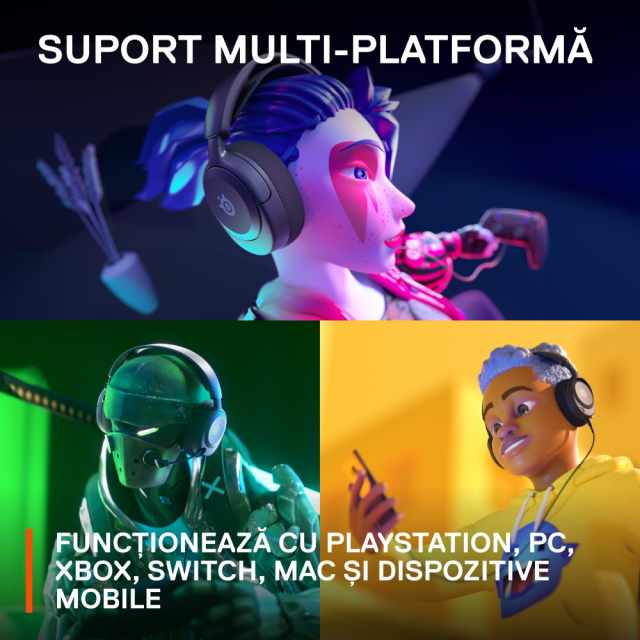 Arctis Nova 1P funcționează cu multiple platforme de gaming, jack-ul universal de 3.5 mm fiind compatibil cu PlayStation, PC, Mac, Xbox și Switch. De asemenea, poți asculta muzică on-the-go de pe mobilul tău.