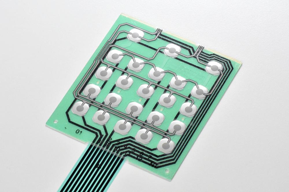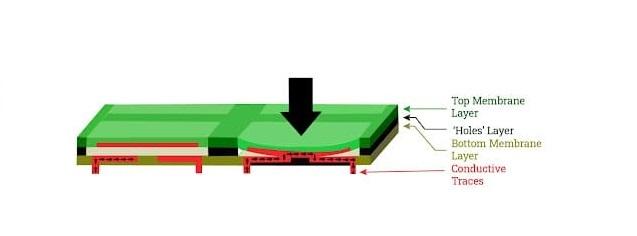 - Stratul inferior are, de asemenea, o bandă metalică conductivă conectată la un circuit electric al dispozitivului. Când butonul de pe stratul superior este apăsat, banda metalică din spatele acesteia va atinge banda metalică a stratului inferior, înregistrând un caracter sau o comandă în sistem.