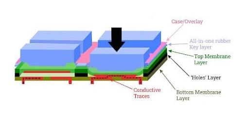 - Celălalt tip elimină utilizarea unei membrane superioare. În schimb, cheile au un strat conductiv pe partea din spate. Când tastele sunt apăsate, stratul de dedesubt atinge stratul inferior.
