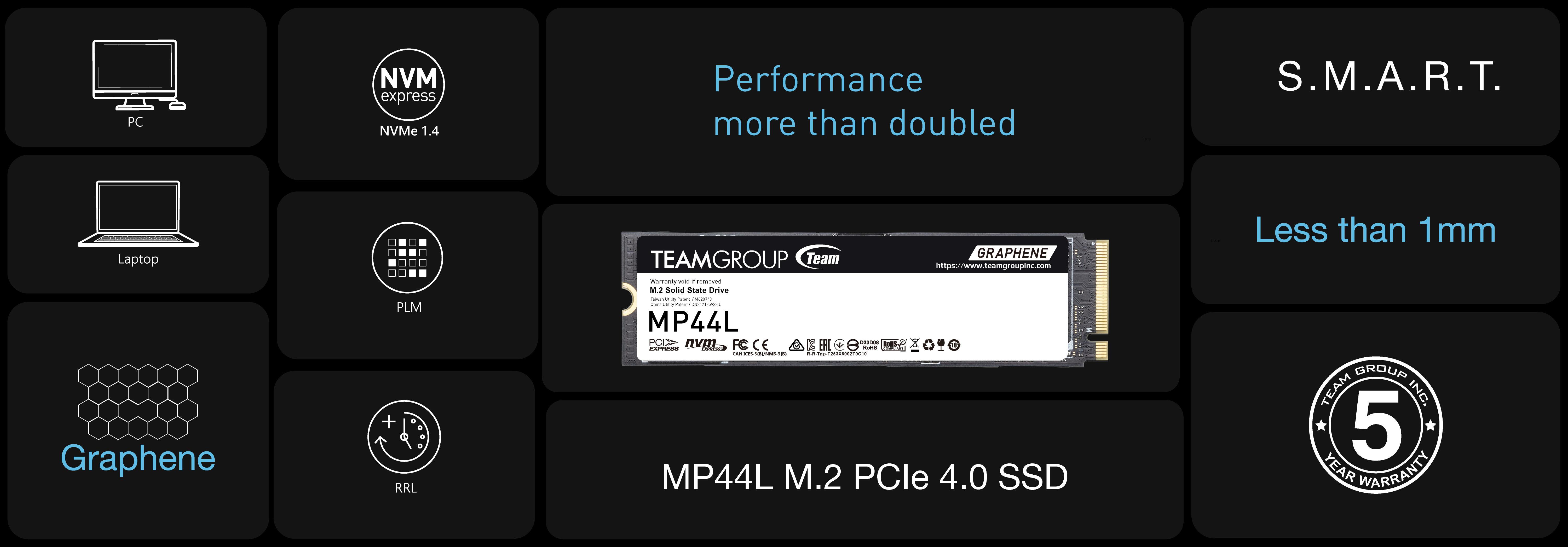 | Interface | PCIe Gen4x4 with NVMe | Dimensions | 80(L) x 22(W) x 2.25(H)mm |