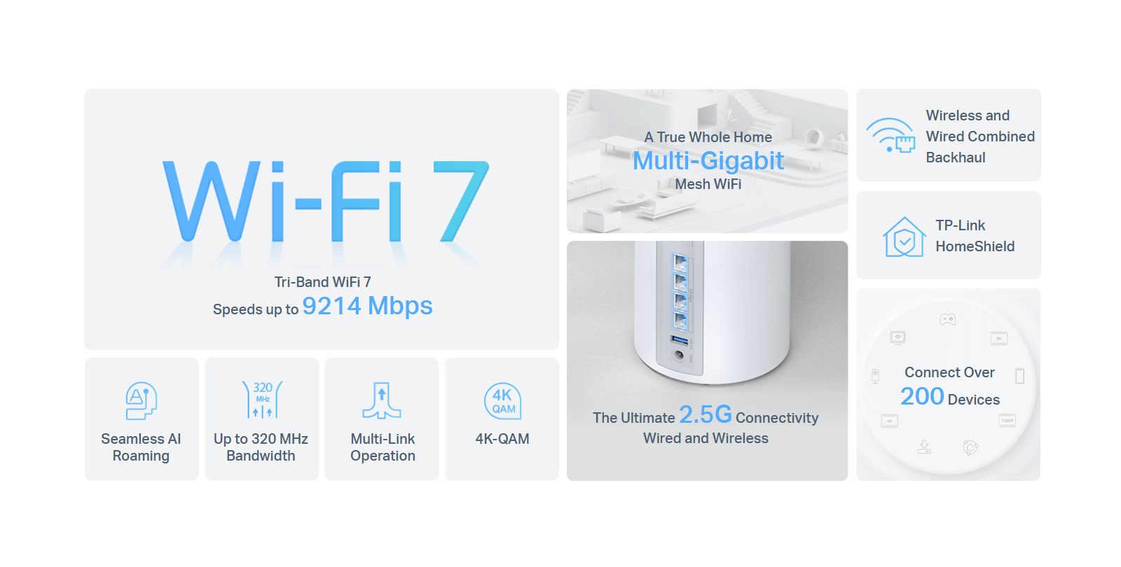 - Wi‑Fi 7 Tri‑Band – viteze combinate de pana la 11 Gbps pentru streaming, gaming si multitasking intens.
