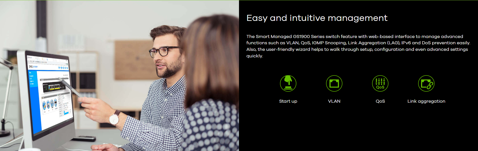 The GS1900 is a series of switches with full non-blocking bandwidth of up to 1 Gbps per port. An ideal upgrade from an unmanaged switch, it’s a great choice for SMBs that want to enjoy high-speed business network applications at full wired non-blocking speed.