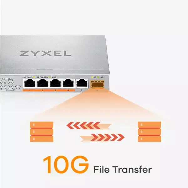 The Zyxel XMG-100 Series 2.5 Gigabit switch is the ideal choice for home, SOHO, or small office users who want to upscale their network with increasing demands coming from online gaming activities, multimedia streaming services or faster wireless network connectivity. All ports are equipped with 2.5 Gigabit Ethernet speed, allowing easy network speed upgrade. In addition, this Series offers an extra SFP+ slot for 10G network uplink or access to a NAS.