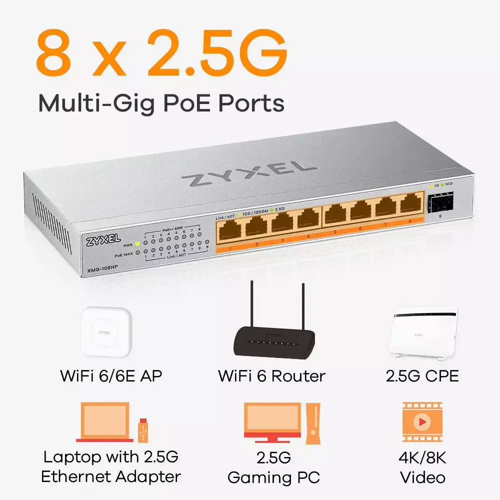 The XMG-100 Series Switch features Multi-Gig ports supporting speeds up to 2.5G, allowing effortless connection to the latest 2.5G-compatible network devices for high-performance networking. Its simplified plug-and-play technology ensures easy setup to seamlessly upgrade your wireless network to WiFi 6/6E by connecting to the PoE models XMG-105HP and XMG-108HP.