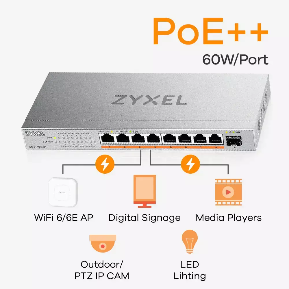 PoE models XMG-105HP and XMG-108HP come with 4/8 uninterrupted PoE++ (60W) ports and a budget-friendly PoE budget of 70W and 100W respectively, deploying PoE devices like WiFi 6/6E APs and PTZ cameras, and IoT devices has never been easier.