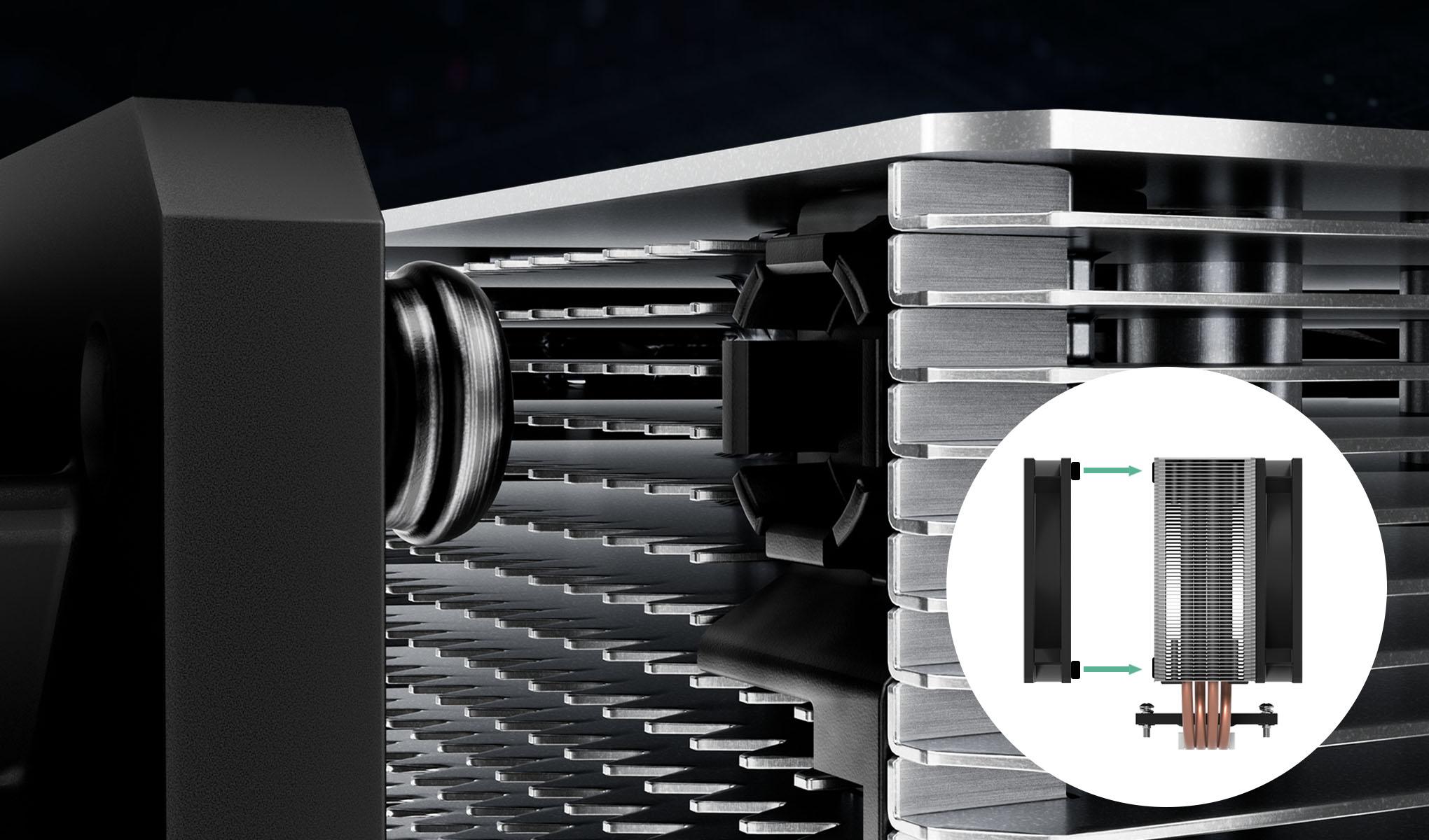 The fins of the heatsink are open at the side and allow the pull fan to draw additional