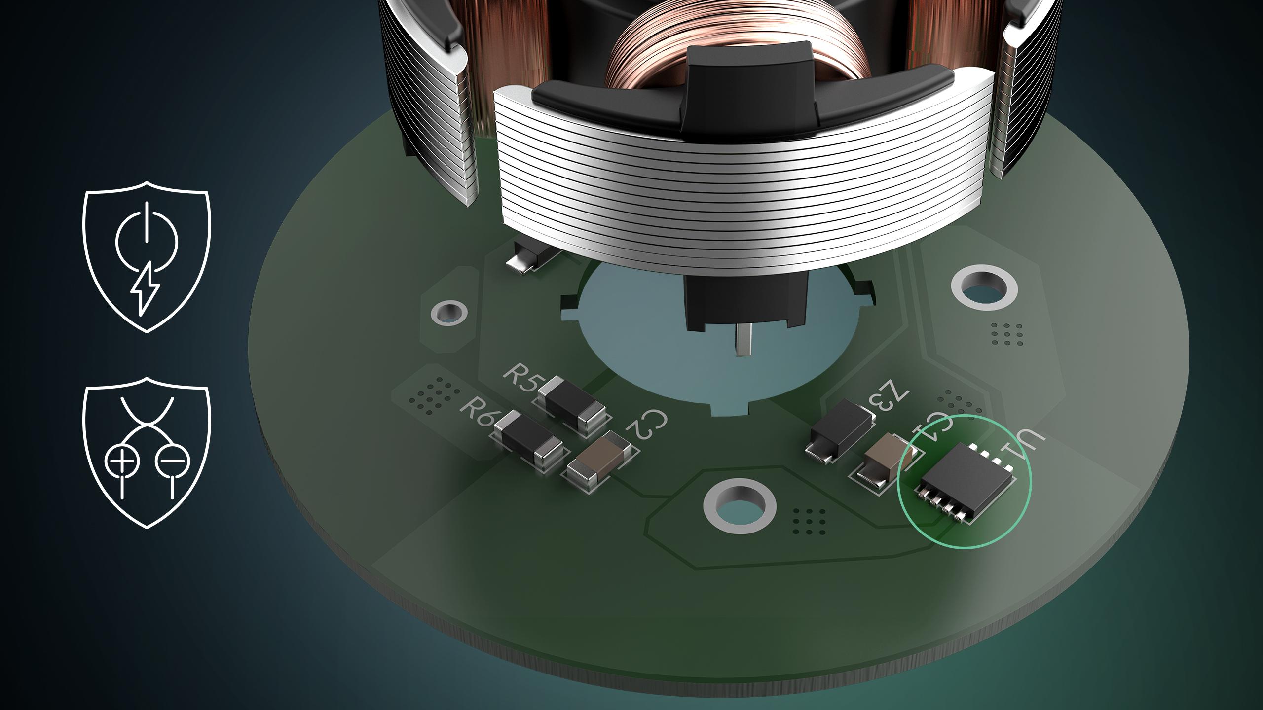 Reduces motor noise, compensates for load fluctuations, and protects against inrush currents and reverse polarity.