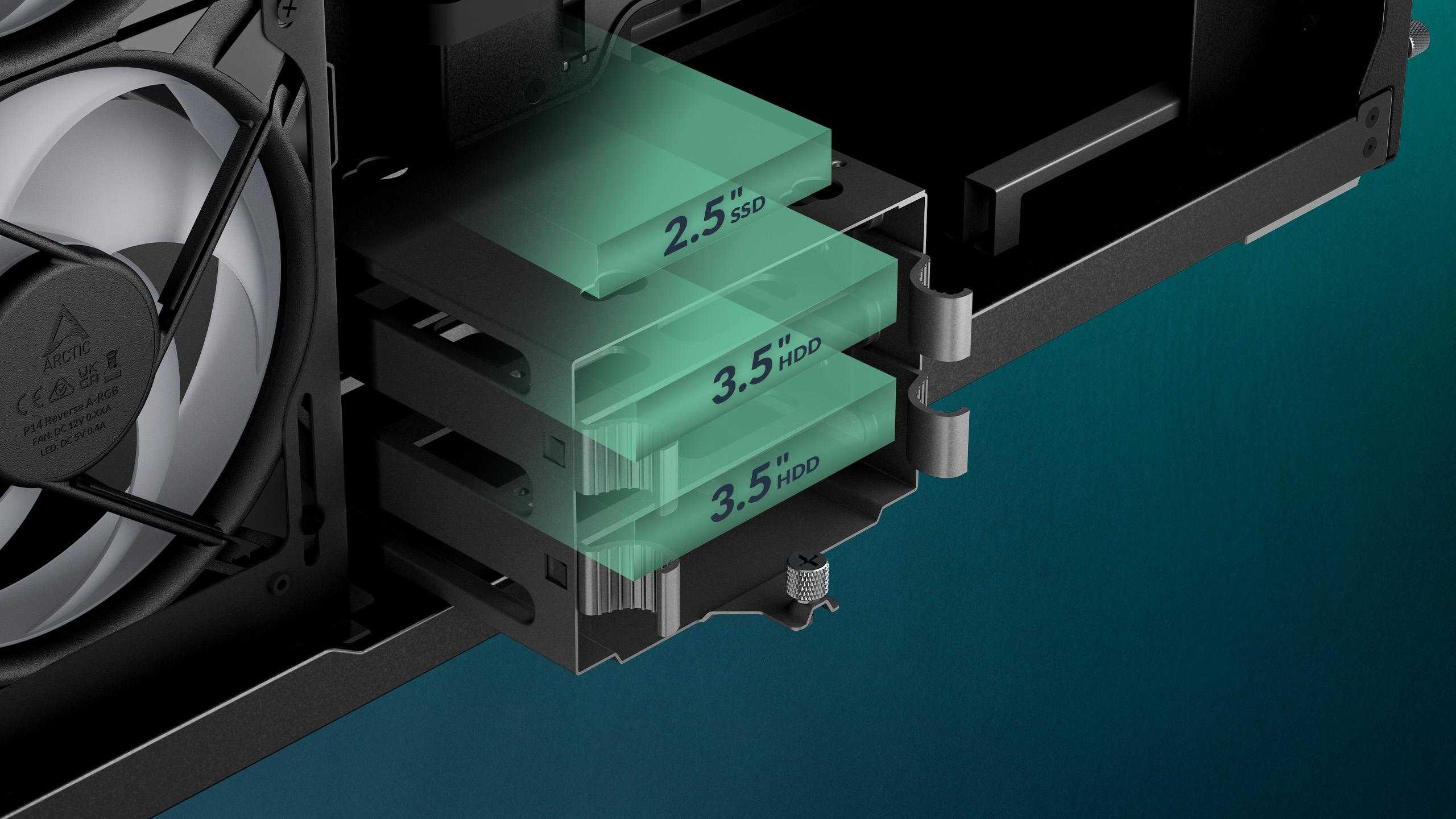 Supports three 2.5" drives behind the motherboard tray. Removable drive cage holds two 3.5"/2.5" and one additional 2.5" drive.