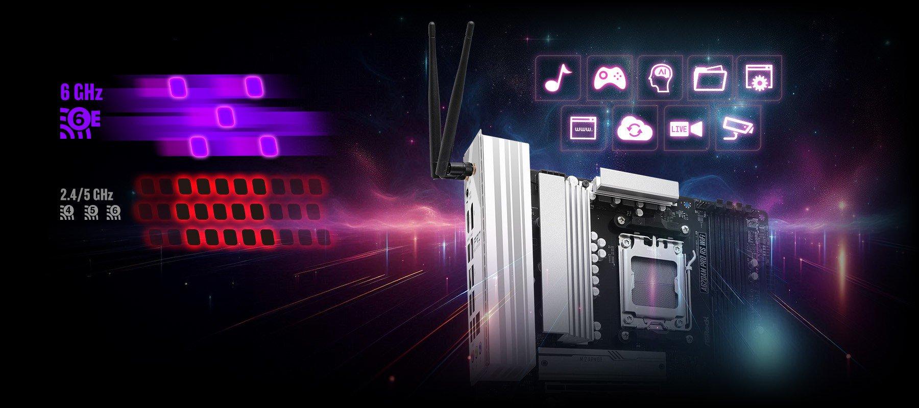 | CPU | - Supports AMD Socket AM5 Ryzen 9000, 8000 and 7000 Series Processors* *Please refer to CPU Support List on ASRock's website for more information. The availability of expansion slots may vary by CPU. Please refer to PCIe/M.2 Bandwidth Table for details. |