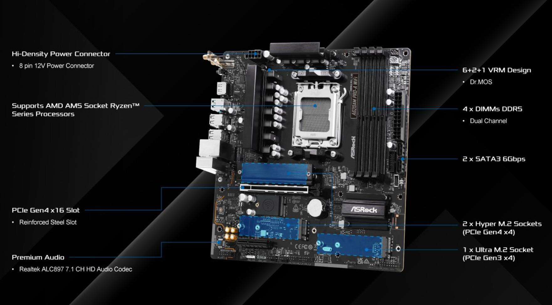 | Unique Feature | Superb Productivity - Dual Channel DDR5 Rock-Solid Durability - 6+2+1 Power Phase, Dr.MOS Ultrafast Connectivity - 2.5G LAN, 802.11axe Wi-Fi 6E Module EZ Update - BIOS Flashback Button - ASRock Auto Driver Installer EZ Troubleshooter - ASRock Post Status Checker |