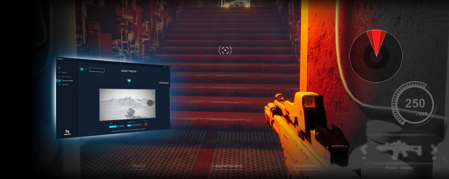 The Sound Tracker is a visual indicator that points out the directions from which predominant sounds are coming. Each sound is properly positioned in 360° on a radar for a full immersion during the game.