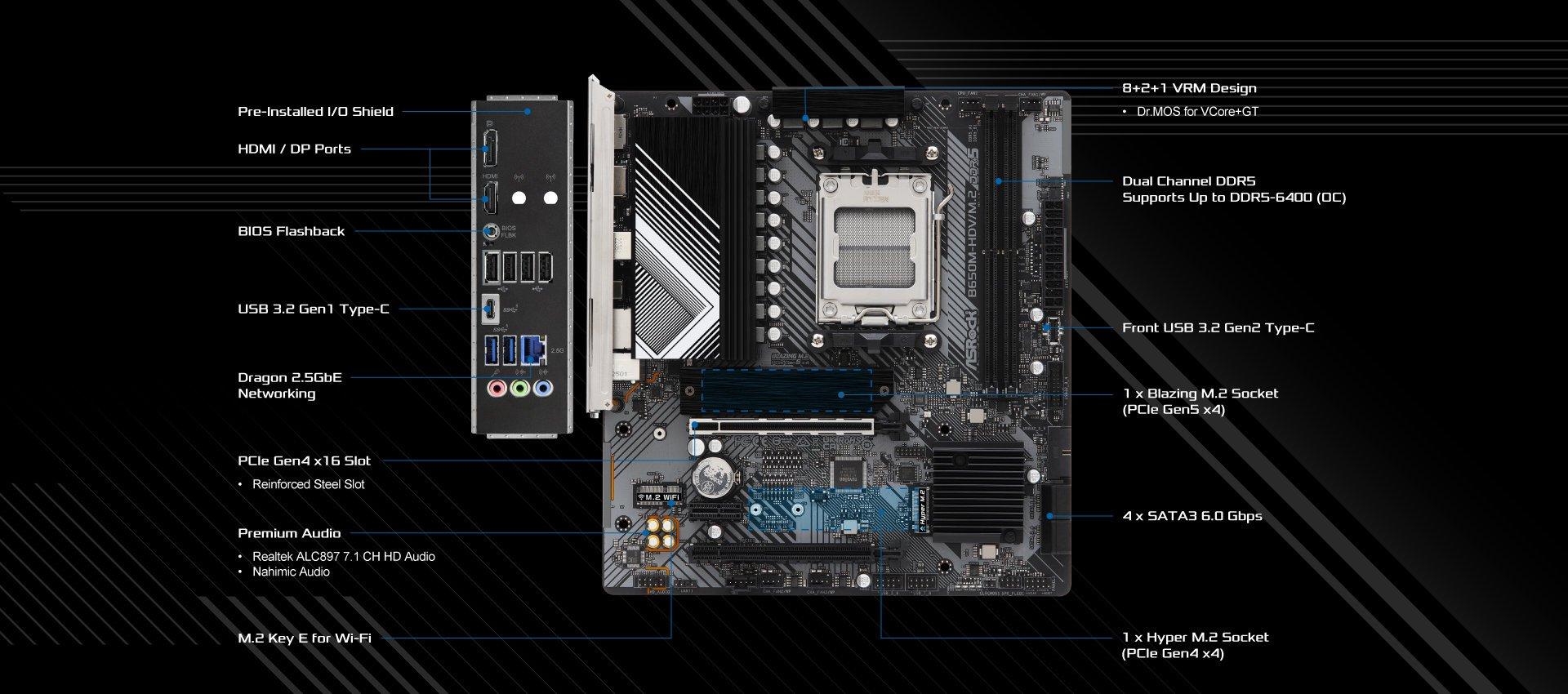 | Unique Feature | Superb Productivity - PCIe Gen5 (M.2) - Dual Channel DDR5 Rock-Solid Durability - 8+2+1 Power Phase, 50A Dr.MOS - Pre-Installed I/O Shield Ultrafast Gaming - 2.5G LAN EZ Update - BIOS Flashback Button - ASRock Auto Driver Installer EZ Troubleshooter - ASRock Post Status Checker |