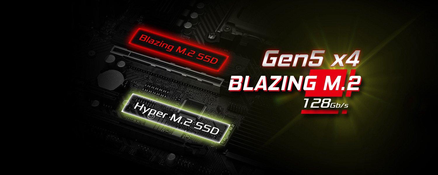 | Storage | CPU: - 1 x Blazing M.2 Socket (M2_1, Key M), supports type 2280 PCIe Gen5x4 (128 Gb/s) mode* Chipset: - 1 x Hyper M.2 Socket (M2_2, Key M), supports type 2260/2280 PCIe Gen4x4 (64 Gb/s) mode* - 4 x SATA3 6.0 Gb/s Connectors *Supports NVMe SSD as boot disks