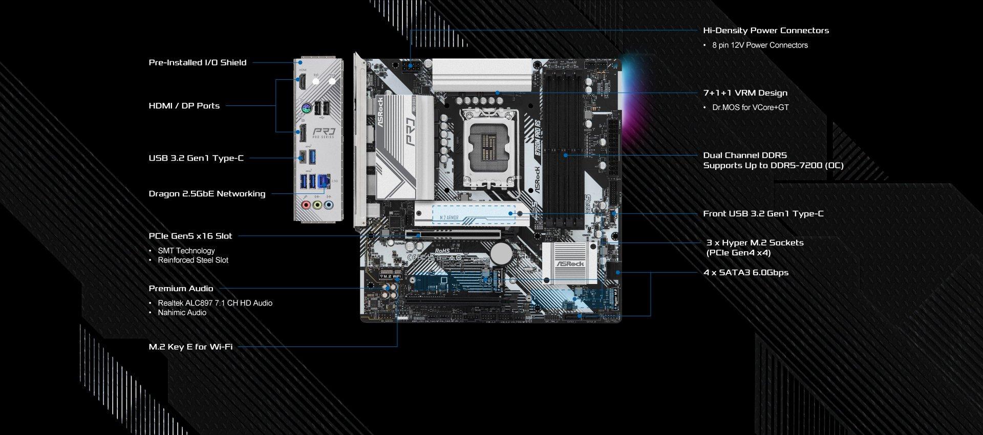 Superb Productivity - PCIe Gen5 (Graphics) - Dual Channel DDR5 Rock-Solid Durability - 7+1+1 Power Phase, 50A Dr.MOS for VCore+GT - Pre-Installed I/O Shield Ultrafast Connectivity - 2.5G LAN EZ Update - ASRock Auto Driver Installer EZ Troubleshooter - ASRock Post Status Checker |