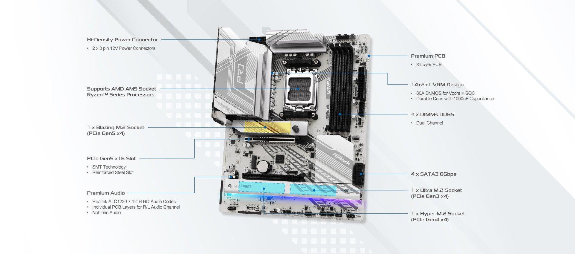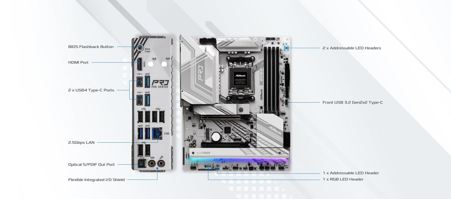 | Unique Feature | Superb Productivity - PCIe Gen5 (Graphics, M.2) - Dual Channel DDR5 - USB4 Type-C Ports (40 Gb/s) Rock-Solid Durability - 14+2+1 Power Phase, 80A Dr.MOS for VCore+SOC+MISC with Enlarged Heatsink Armor - Flexible Integrated I/O Shield Ultrafast Connectivity - 2.5G LAN EZ Update - BIOS Flashback Button - ASRock Auto Driver Installer EZ Troubleshooter - ASRock Post Status Checker |