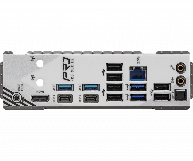 | Rear Panel I/O | - 2 x Antenna Ports - 1 x HDMI Port - 1 x Optical SPDIF Out Port - 2 x USB4 Type-C Ports (40 Gb/s)* - 4 x USB 3.2 Gen1 Type-A Ports - 6 x USB 2.0 Ports - 1 x RJ-45 LAN Port - 1 x BIOS Flashback Button - 1 x Line Out Jack (Gold Audio Jack) - 1 x Microphone Input Jack (Gold Audio Jack) * Supports USB PD 3.0 up to 5V@3A (15W) charging