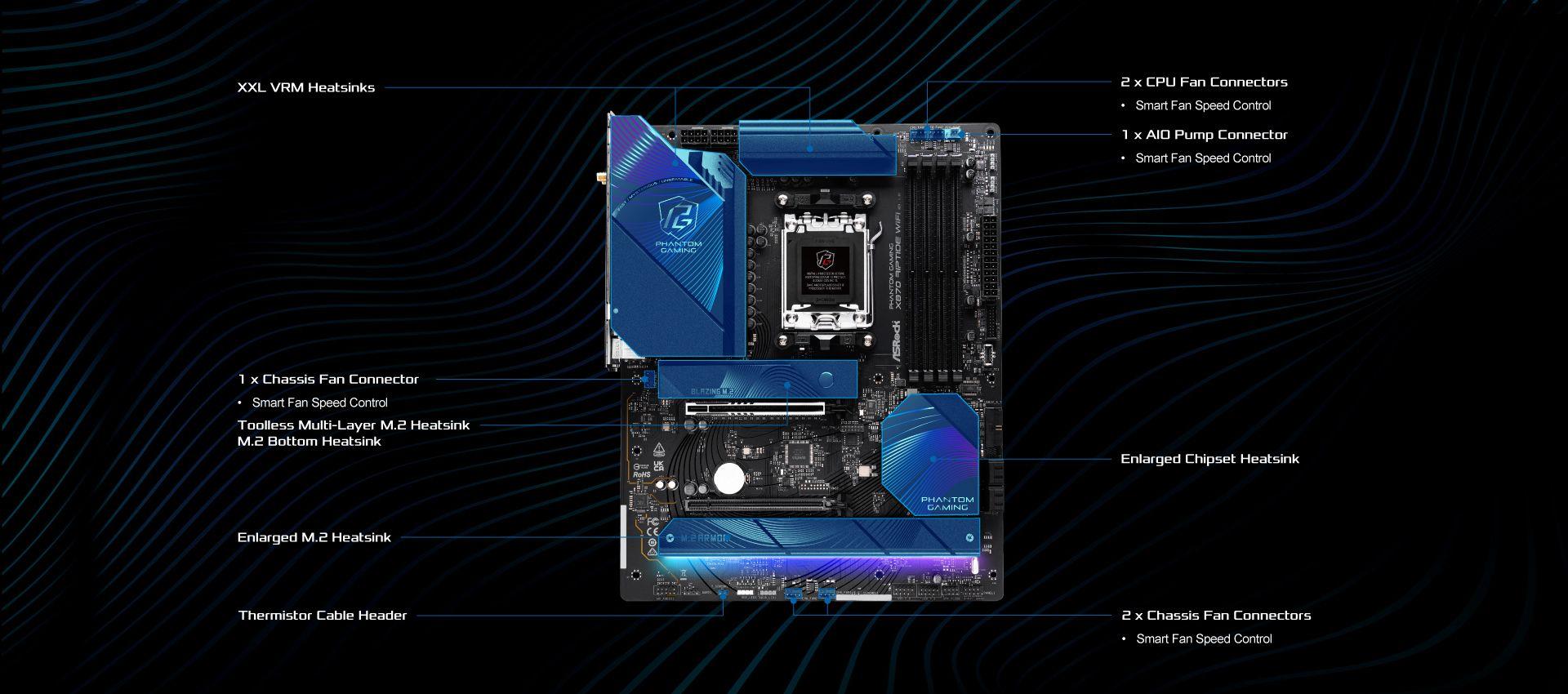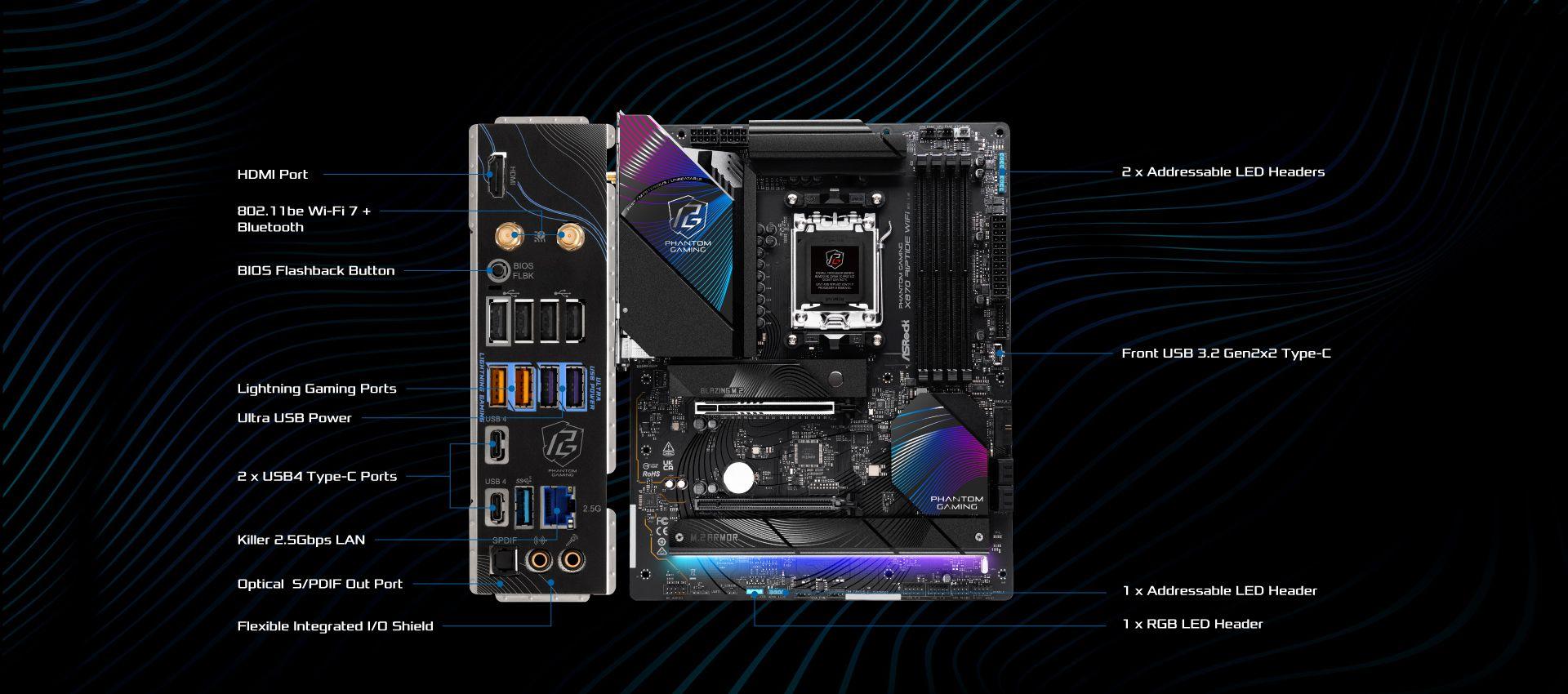 | Unique Feature | Superb Productivity - PCIe Gen5 (Graphics, M.2) - Dual Channel DDR5 - USB4 Type-C Ports (40 Gb/s) Rock-Solid Durability - 14+2+1 Power Phase, 80A Dr.MOS for VCore+SOC with Enlarged Heatsink Armor - Flexible Integrated I/O Shield - 20K Long-lasting Black Caps (high quality and conductive polymer capacitors) Ultrafast Gaming - Killer 2.5G LAN, 802.11be Wi-Fi 7 Module - ASRock Lightning Gaming Ports EZ Update - BIOS Flashback Button - ASRock Auto Driver Installer EZ Troubleshooter - ASRock Post Status Checker |