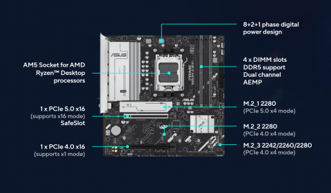 | CPU | AMD Socket AM5 for AMD Ryzen 9000 & 8000 & 7000 Series Desktop Processors* * Refer to https://www.asus.com/support/download-center/ for CPU support list. |