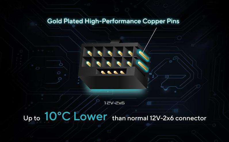 The copper pins of the PCIe connectors in this PSU have been upgraded with gold plating to help ensure cooler operation and improved power delivery efficiency. This plating translates to a significant reduction in normal 12V-2x6 connector temperatures (up to 10°C), promoting optimal performance and stability for even the most demanding graphics cards. Furthermore, the improved contact between socket pins and connectors reduces resistance and improves durability for connector insertion and removal, ensuring reliable cooling performance.