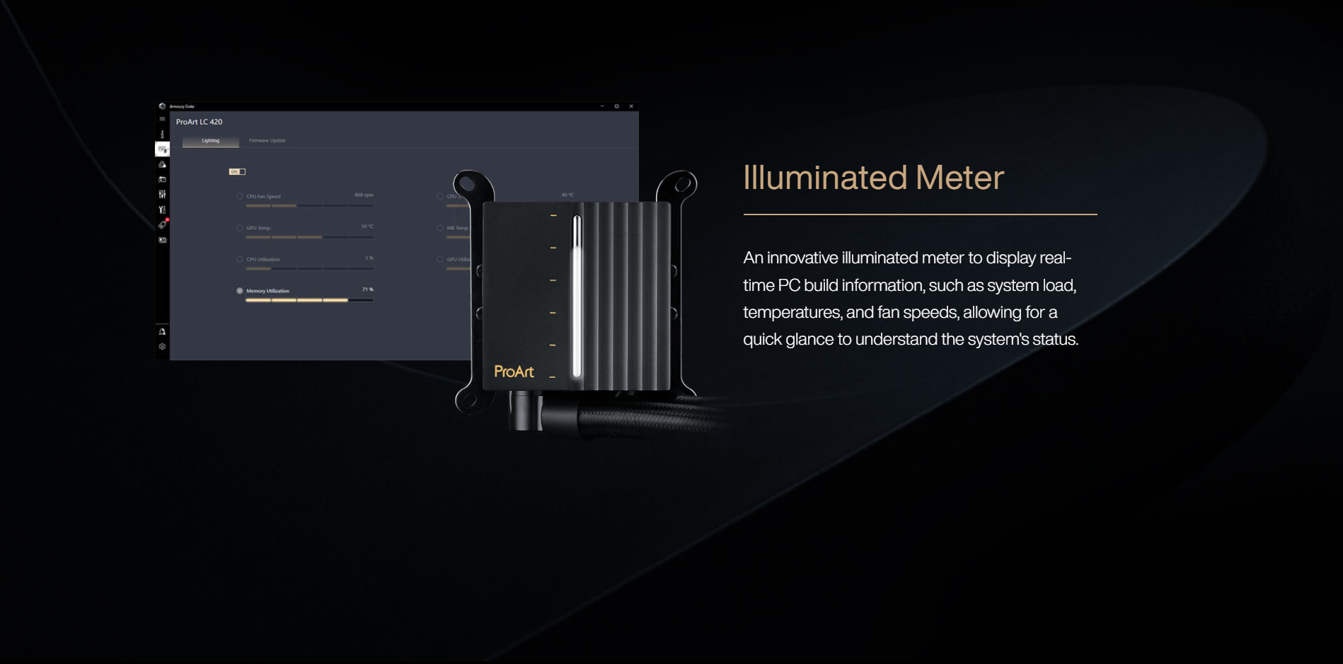 Stealth Metal Power fans, the ProArt LC 360 expertly integrates premium tech into an elegantly understated design. An illuminated