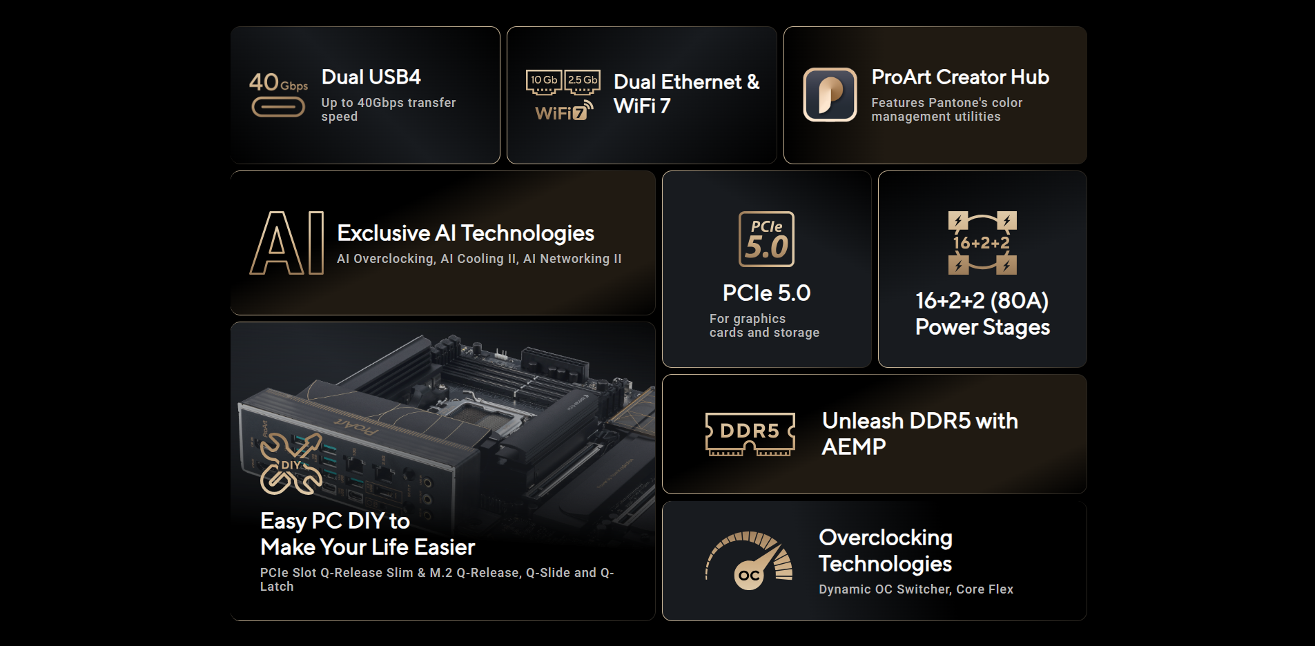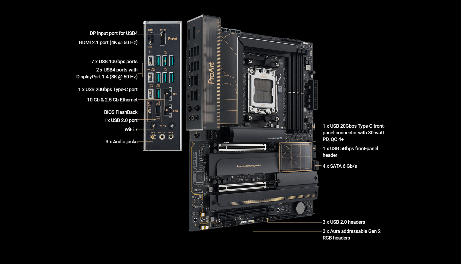 The ProArt X870E-Creator WiFi empowers creators of all levels by maximizing the performance of the latest AMD Ryzen 9000, 8000 and