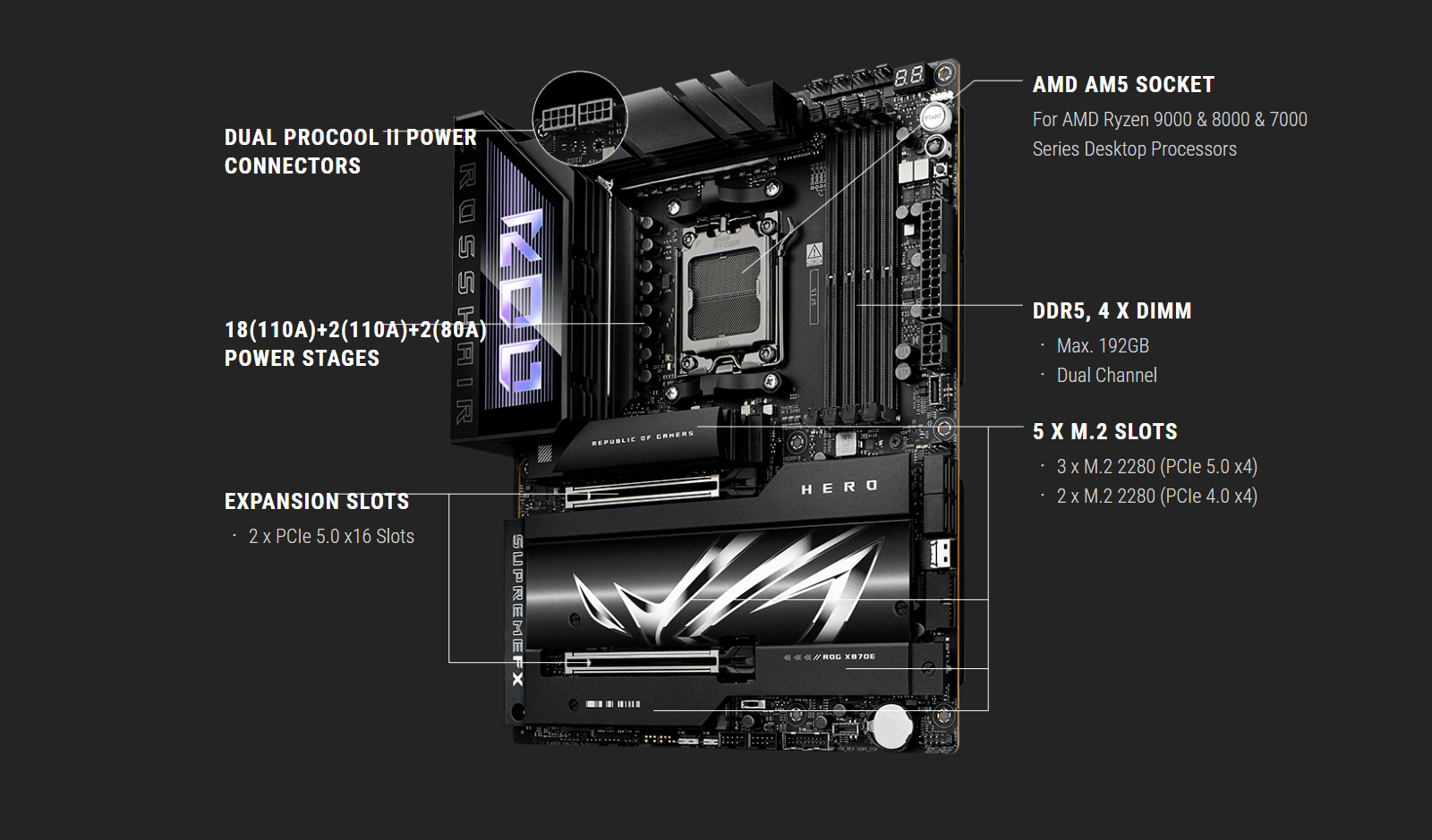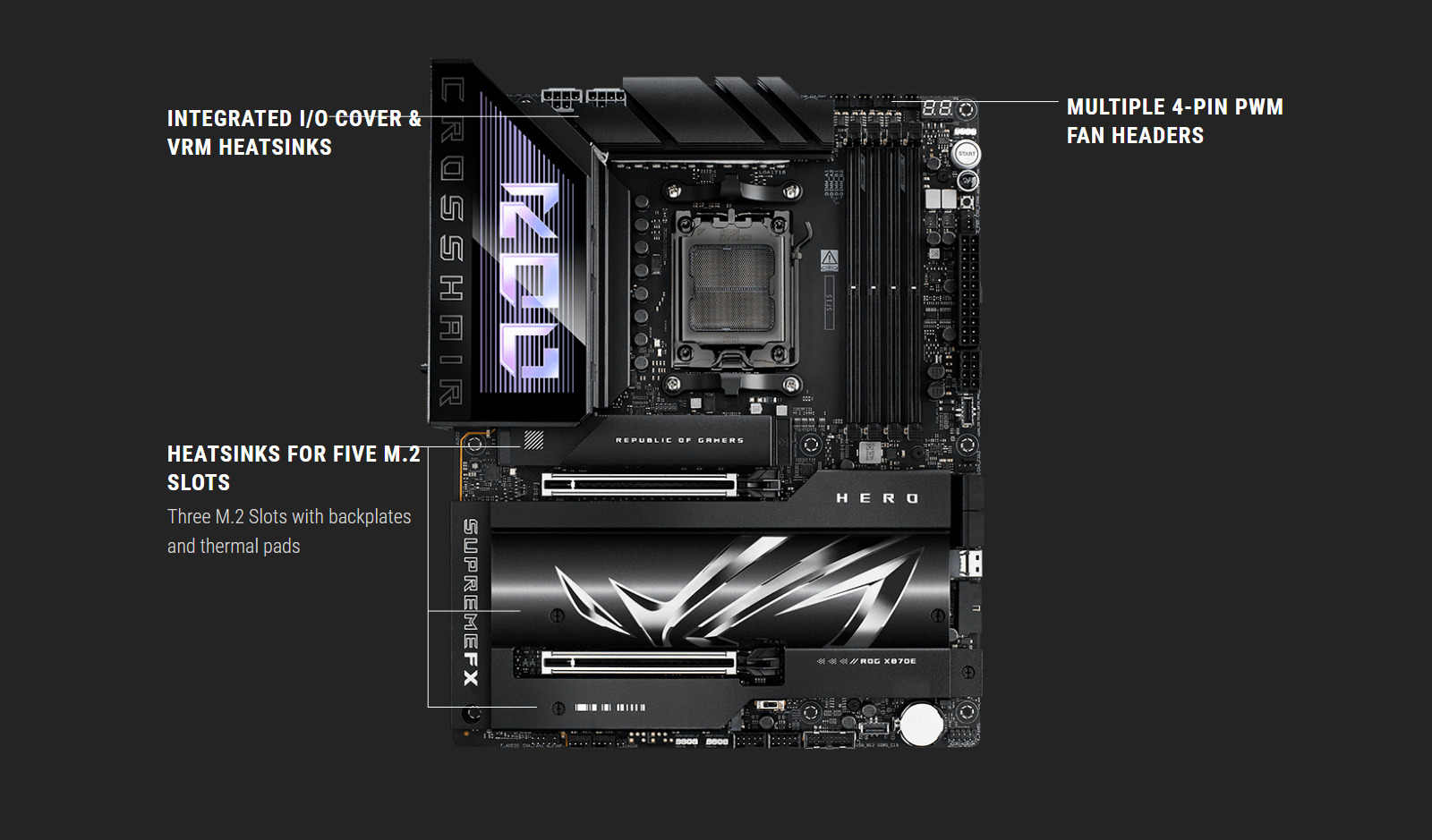 The AI PC-ready ROG Crosshair X870E Hero offers unyielding power delivery,