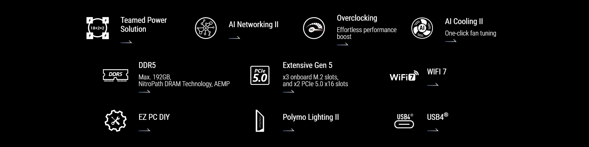 | Memory | 4 x DIMM slots, max.192GB, DDR5 Supports up to 8200+MT/s(OC) with Ryzen 9000 Series Processors, 8600+MT/s(OC) with Ryzen 8000 Series Processors, 8000+MT/s(OC) with Ryzen 7000 Series Processors, ECC and Non-ECC, Un-buffered Memory* Dual channel memory architecture Supports AMD Extended Profiles for Overclocking (EXPO) NitroPath DRAM Technology ASUS Enhanced Memory Profile (AEMP) * Supported memory types, data rate (speed), and number of DRAM modules vary depending on the CPU and memory configuration, for more information please refer to CPU/Memory Support list under the Support tab of product information site or visit https://www.asus.com/support/download-center/. * Non-ECC, un-buffered DDR5 memory supports On-Die ECC function. |