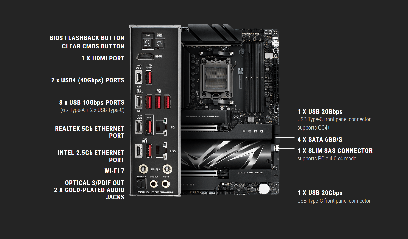 | Back Panel I/O Ports | 2 x USB4 (40Gbps) ports (2 x USB Type-C) 8 x USB 10Gbps ports (6 x Type-A + 2 x USB Type-C) 1 x HDMI port 1 x Wi-Fi module 1 x Intel 2.5Gb Ethernet port 1 x Realtek 5Gb Ethernet port 2 x Gold-plated audio jacks 1 x Optical S/PDIF out port 1 x BIOS FlashBack button 1 x Clear CMOS button |