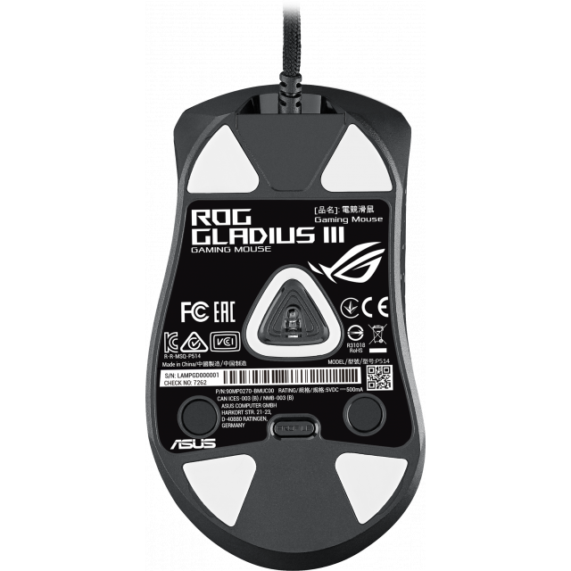 The sensor on the underside of both Gladius III mice is a brand-new optical unit with a resolution up to 19,000 DPI, capable of handling 50g of acceleration and tracking at up to a whopping 400 inches per second. We’ve made sure this sensor offers 1:1 tracking for pixel-precise movements, and it’s devoid of annoying angle snapping or other motion processing. Regardless of whether you're playing high-octane twitchy shooters or enjoying some quality time planning out your conquests in real-time strategy games, the ROG Gladius III will track even the most subtle movements with utmost precision.