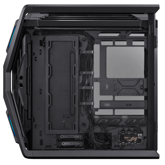 ROG Hyperion GR701 BTF Edition е висококласна геймърска компютърна кутия, създадена за максимално охлаждане, управление на кабелите и премиум дизайн. Отличава се с скрити конектори на дънната платка, което позволява чист и подреден външен вид.