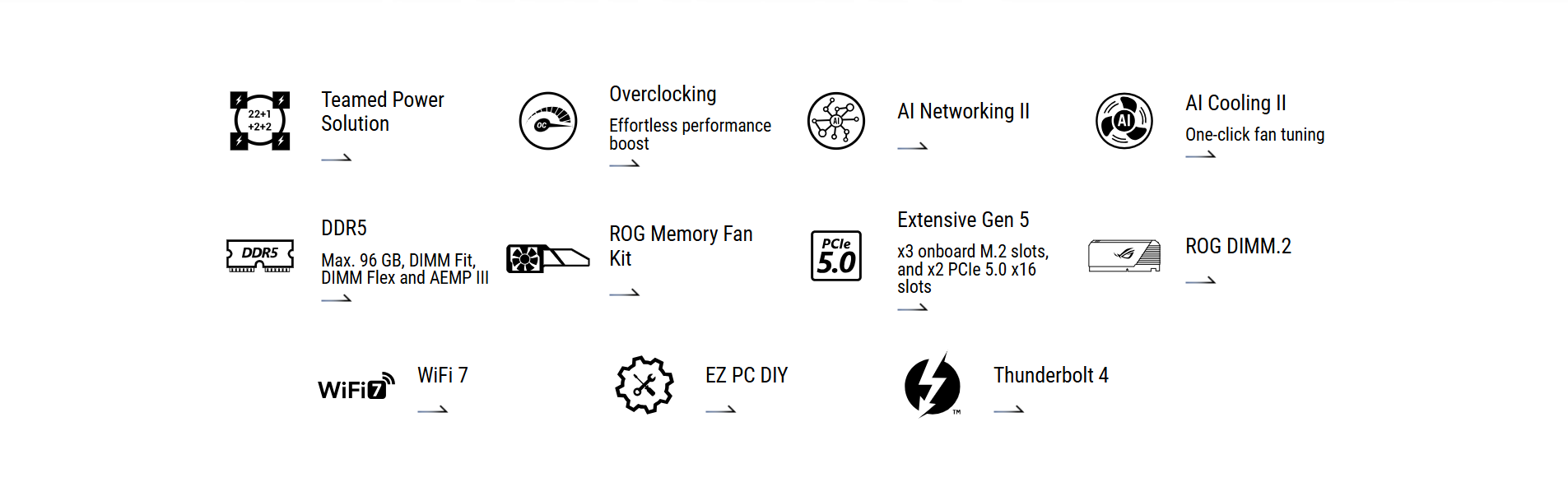 | Software Features | ROG Exclusive Software - ROG CPU-Z - Dolby Atmos - Internet Security (1-year full version) ASUS Exclusive Software Armoury Crate - AIDA64 Extreme (1 year full version) - Aura Creator - Aura Sync - Fan Xpert 4 (with AI Cooling II) - GameFirst - Power Saving - HWiNFO ASUS AI Advisor ASUS Driver Hub ASUS GlideX Turbo Vcore Adobe Creative Cloud (Free Trial) Thunderbolt Share USB Wattage Watcher WinRAR (40 Days Free Trial) UEFI BIOS AI Overclocking Guide ASUS EZ DIY - ASUS CrashFree BIOS 3 - ASUS EZ Flash - ASUS UEFI BIOS EZ Mode - ASUS MyHotkey NPU Boost |