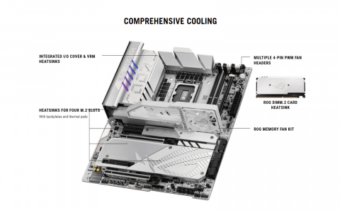 | Accessories | ROG DIMM.2 with Heatsink 1 x ROG DIMM.2 with heatsink 1 x M.2 pad for ROG DIMM.2 2 x M.2 screw package for ROG DIMM.2 Additional Cooling Kit 1 x Thermal pad for M.2 22110 1 x ROG Memory Fan Kit Miscellaneous 1 x ASUS WiFi Q-Antenna 1 x Q-connector 1 x ROG VIP card 3 x M.2 Q-Slide package 5 x M.2 backplate rubber packages 1 x ROG Bottle Opener Installation Media 1 x USB drive with utilities and drivers Documentation 1 x Quick start guide |
