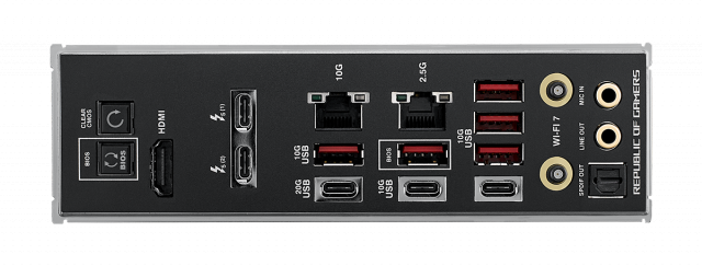 | Back Panel I/O Ports | 2 x Thunderbolt 5 USB Type-C ports 1 x USB 20Gbps port (1 x USB Type-C) 7 x USB 10Gbps ports (5 x Type-A + 2 x USB Type-C) 1 x HDMITM port 1 x Wi-Fi Module 1 x Intel 2.5Gb Ethernet port 1 x Marvell AQtion 10Gb Ethernet port 2 x LED-illuminated audio jacks 1 x Optical S/PDIF out port 1 x BIOS FlashBack button 1 x Clear CMOS button |