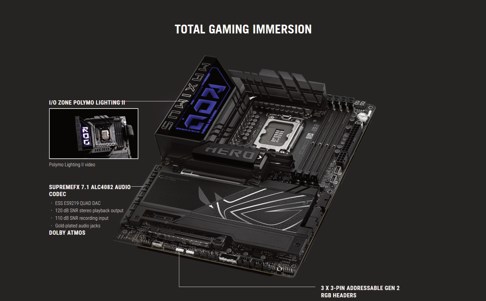 | Software Features | ROG Exclusive Software - ROG CPU-Z - Dolby Atmos - Polymo Lighting II - Internet Security (1-year full version) ASUS Exclusive Software Armoury Crate - AIDA64 Extreme (1 year full version) - Aura Creator - Aura Sync - Fan Xpert 4 (with AI Cooling II) - GameFirst - Power Saving - Hwinfo ASUS AI Advisor ASUS DriverHub ASUS GlideX Thunderbolt Share USB Wattage Watcher TurboV Core Adobe Creative Cloud (Free Trial) WinRAR (40 Days Free Trial) UEFI BIOS NPU Boost AI Overclocking Guide ASUS EZ DIY - ASUS CrashFree BIOS 3 - ASUS EZ Flash - ASUS UEFI BIOS EZ Mode - ASUS MyHotkey FlexKey |
