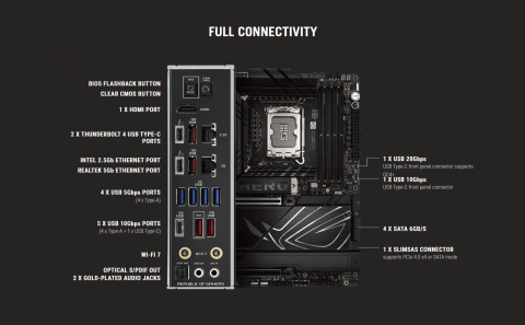 | Back Panel I/O Ports | 2 x Thunderbolt 4 USB Type-C ports 5 x USB 10Gbps ports (4 x Type-A + 1 x USB Type-C) 4 x USB 5Gbps ports (4 x Type-A) 1 x HDMI port 1 x Wi-Fi module 1 x Intel 2.5Gb Ethernet port 1 x Realtek 5Gb Ethernet port 2 x Gold-plated audio jacks 1 x Optical S/PDIF out port 1 x BIOS FlashBack button 1 x Clear CMOS button |