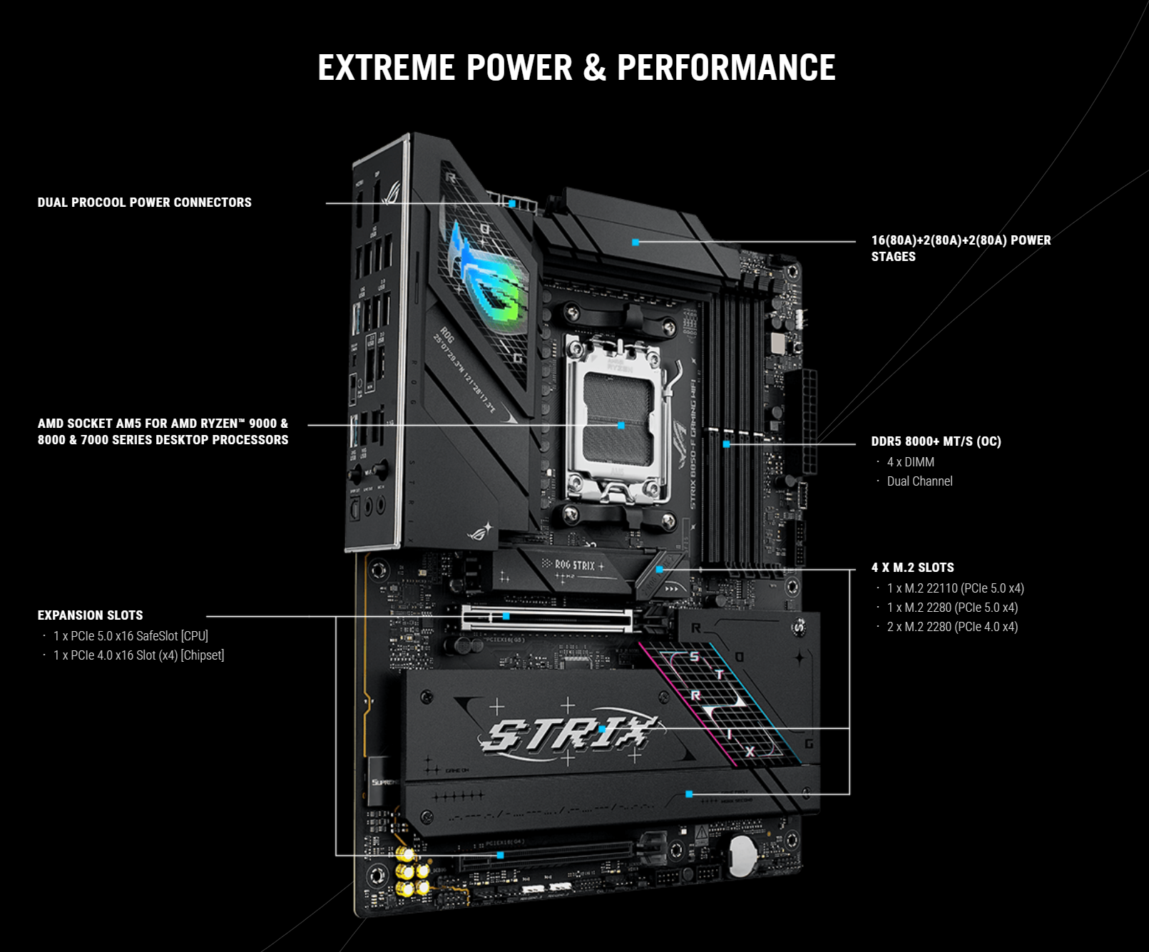 | Expansion Slots | AMD Ryzen 9000 & 7000 Series Desktop Processors 1 x PCIe 5.0 x16 slot with Q-Release Slim AMD Ryzen 8000 Series Desktop Processors 1 x PCIe 5.0 x16 slot with Q-Rlease Slim (supports PCIe 4.0 x8 or x4 mode)* AMD B850 Chipset 1 x PCIe 4.0 x16 slot (supports x4 mode)** * Specifications vary by CPU types. ** PCIEX16(G4) slot (supports x4 mode) from AMD B850 Chipset shares bandwidth with M.2_3 - To ensure compatibility of the device installed, please refer to https://www.asus.com/support/download-center/ for the list of supported peripherals. |
